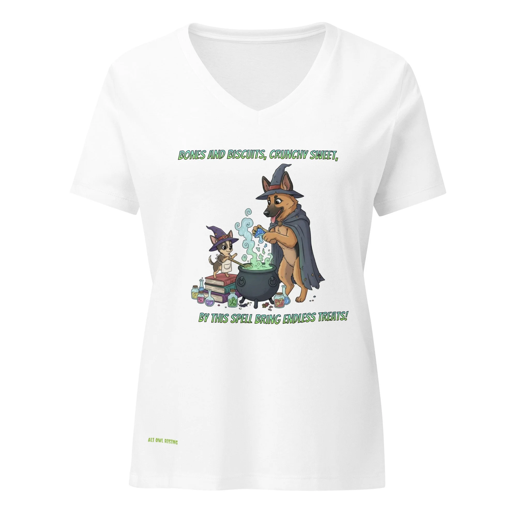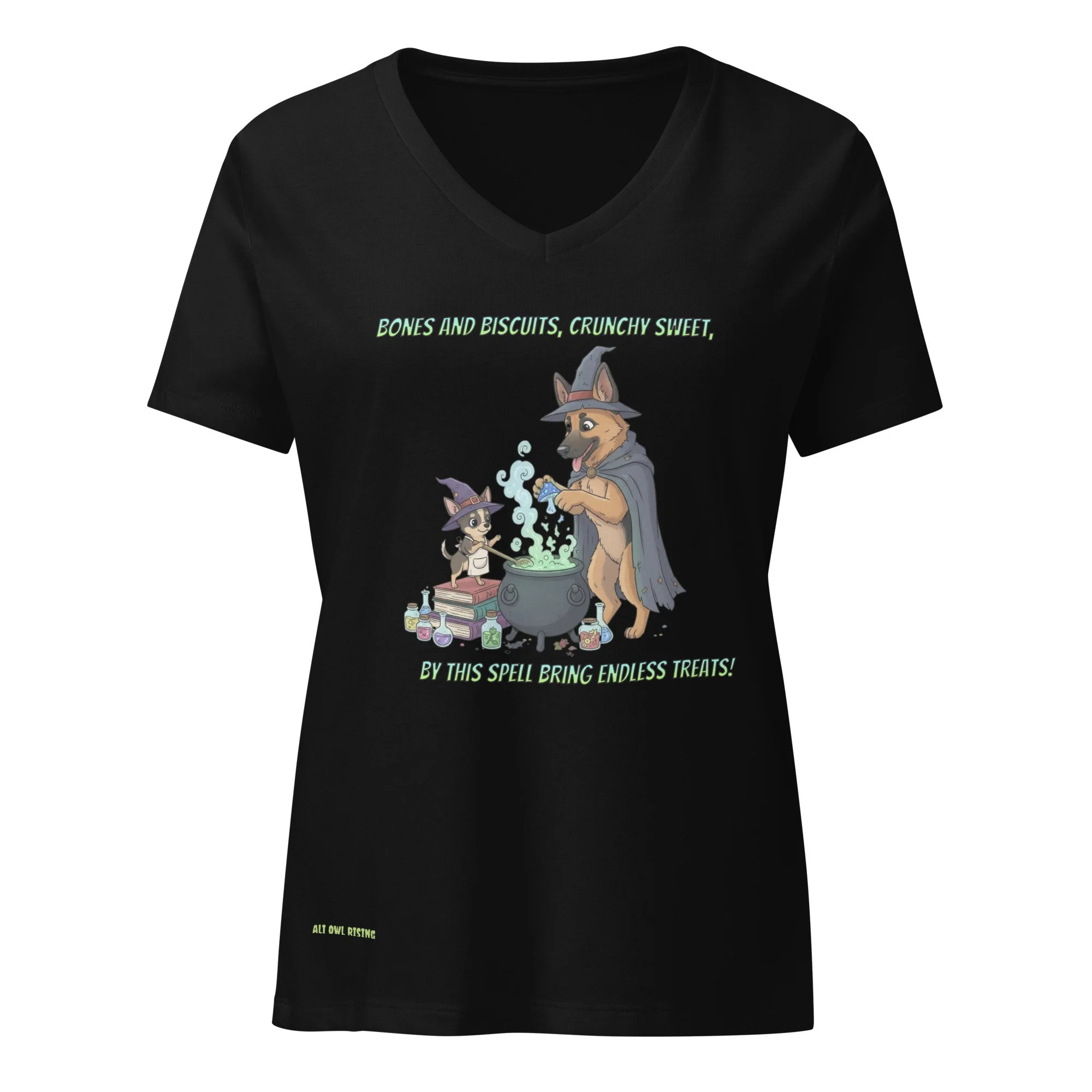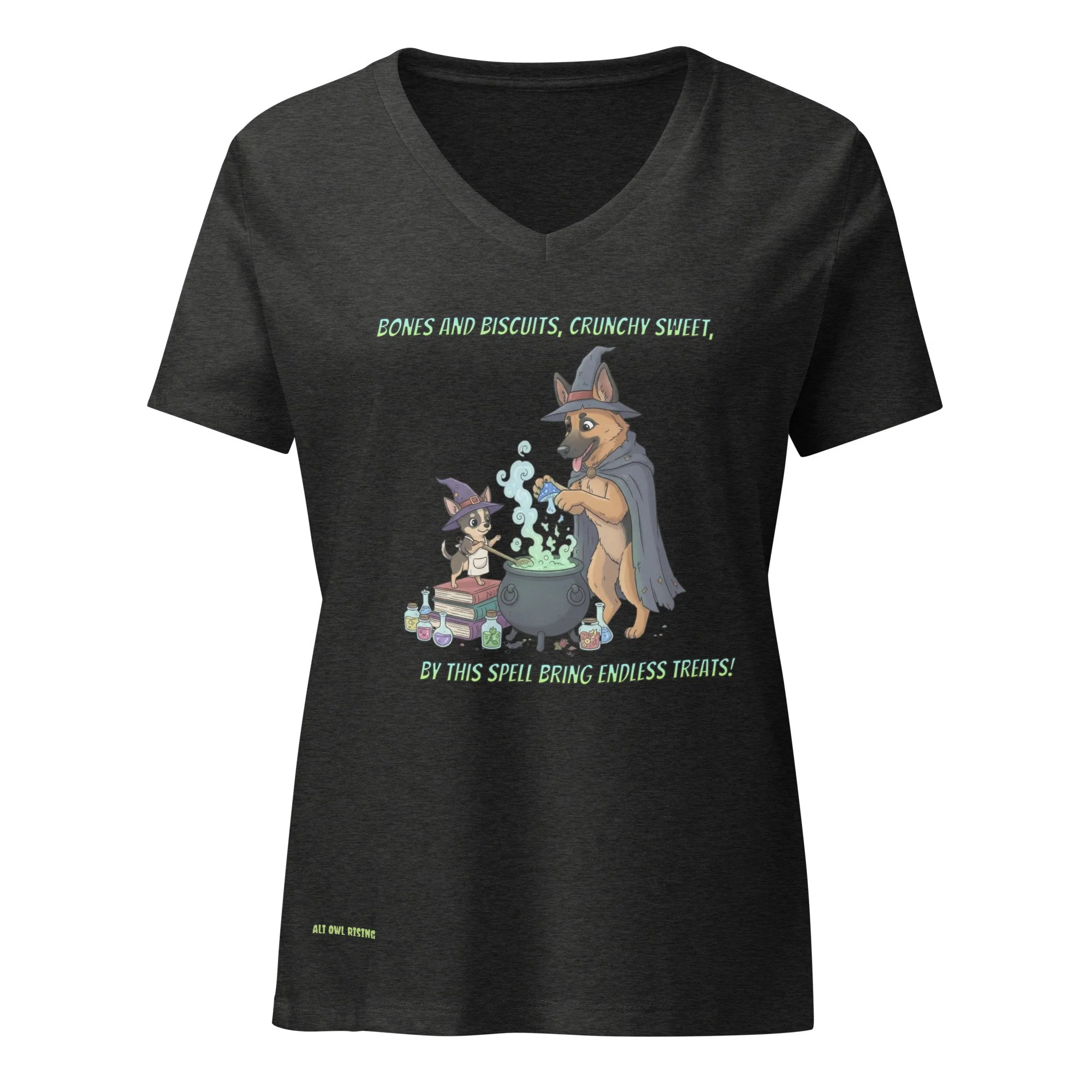 Two mischievous pups stir up a spell where bones and biscuits bubble into crunchy-sweet magic. A treat-filled charm for every witchy dog lover.